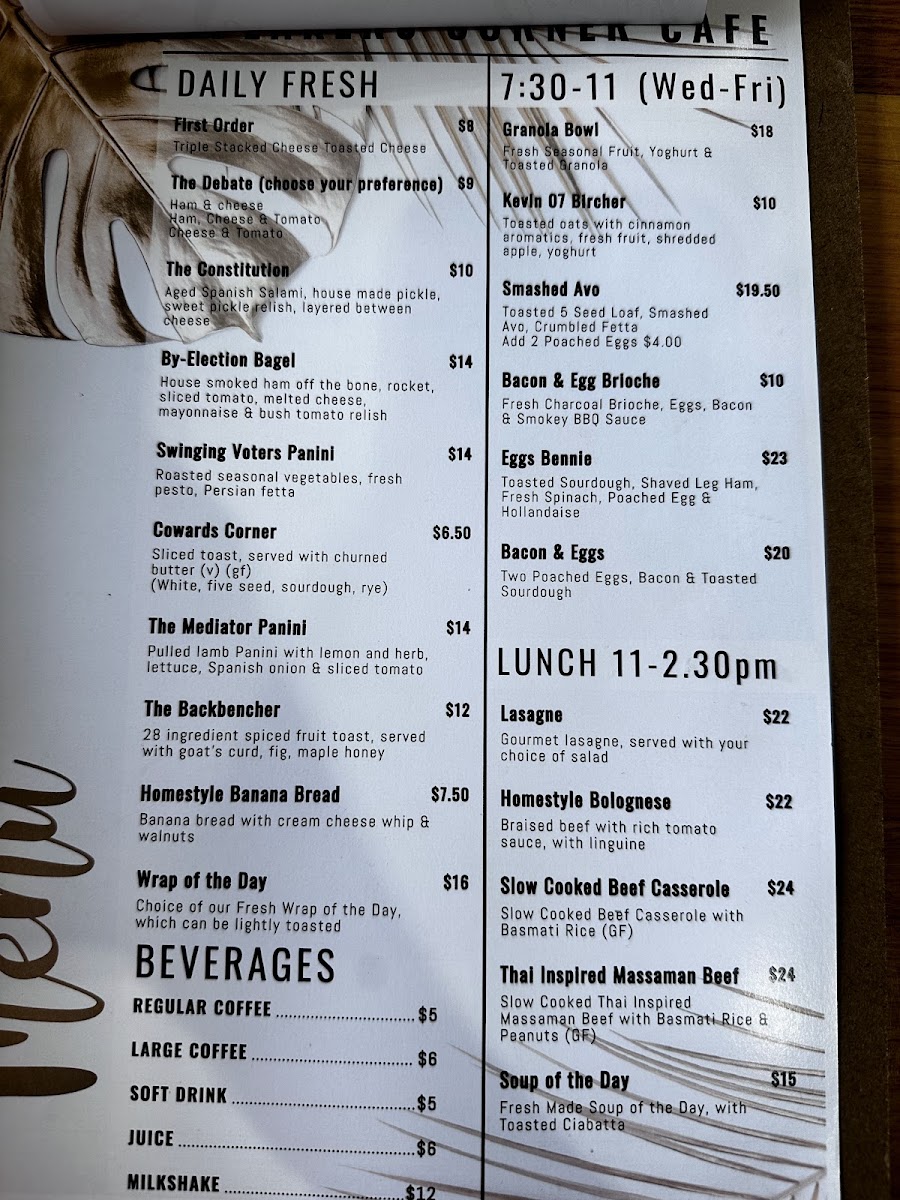 Start your day with options like The Debate or the hearty ByElection Bagel, both perfect for a quick bite. For a more filling lunch, try the Slow Cooked Beef Casserole or Homestyle Bolognese, showcasing the café’s dedication to homestyle cooking. Don't forget to pair your meal with their freshly brewed coffee!